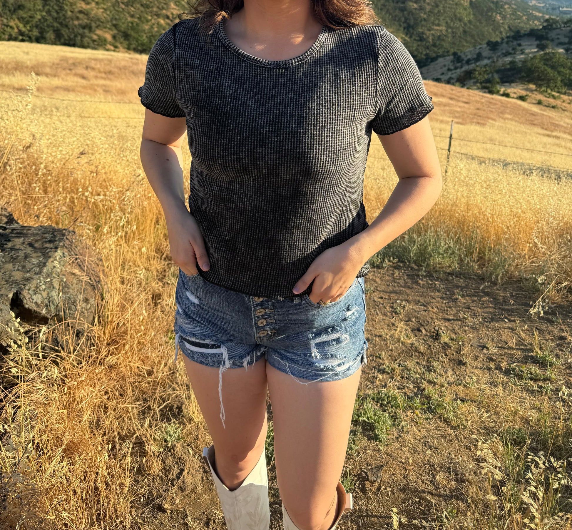 Brighten up any outfit with our Mineral Washed Lettuce Hem Knit Top! Made from a lightweight fabric, this cute top is perfect for a sunny day out. Its unique knit design adds an extra element of style to your wardrobe. Get ready to turn heads with this must-have piece!